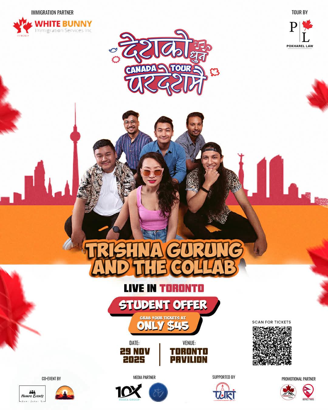 बसन्त कार्की, टोरन्टो — नेपाली चर्चित गायिका तृष्णा गुरुङ्गको कन्सर्ट तयारी पूरा नेपालकी लोकप्रिय गायिका तृष्णा गुरुङ्गको बहुप्रतिक्षित टोरन्टो कन्सर्टका सबै तयारी पूरा भएको आयोजकले जानकारी दिएको छ। क्यानडाको चर्चित इभेन्ट म्यानेजमेन्ट संस्था हाम्रो इभेन्ट र नमो बुद्ध इभेन्ट कम्पनीको आयोजनामा हुन लागेको “तृष्णा गुरुङ्ग एण्ड..
